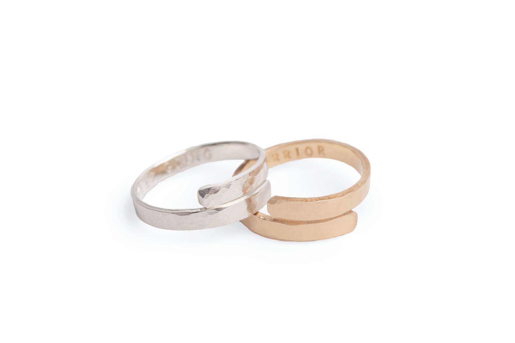Handcrafted from 14k gold filled or sterling silver metal, the ring features a hammered texture on the outside for a modern, organic look. The interior is carefully hand-stamped with your custom personalization.