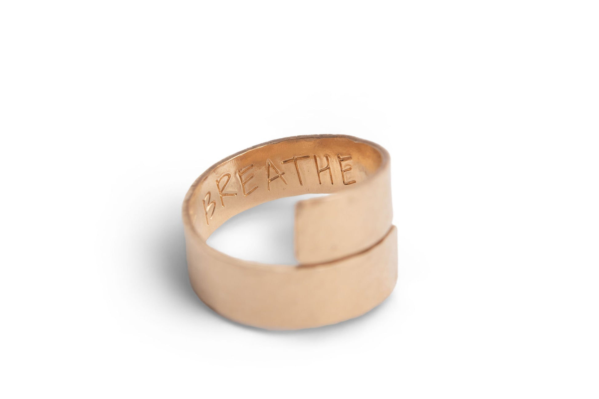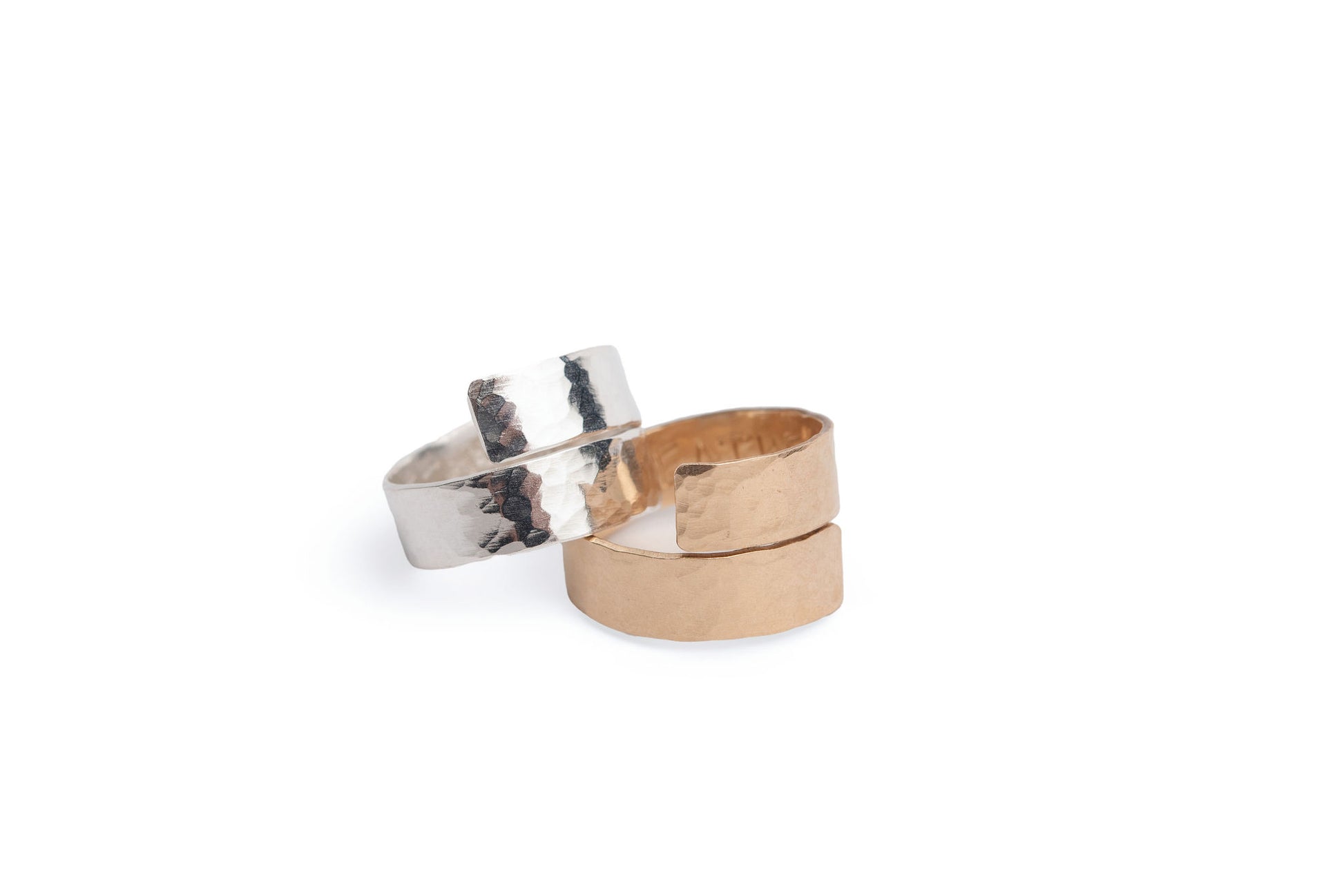 These hammered wrap rings are adjustable and can be hand stamped with your choice of small design on the outside, with your choice of small phrase on the inside
