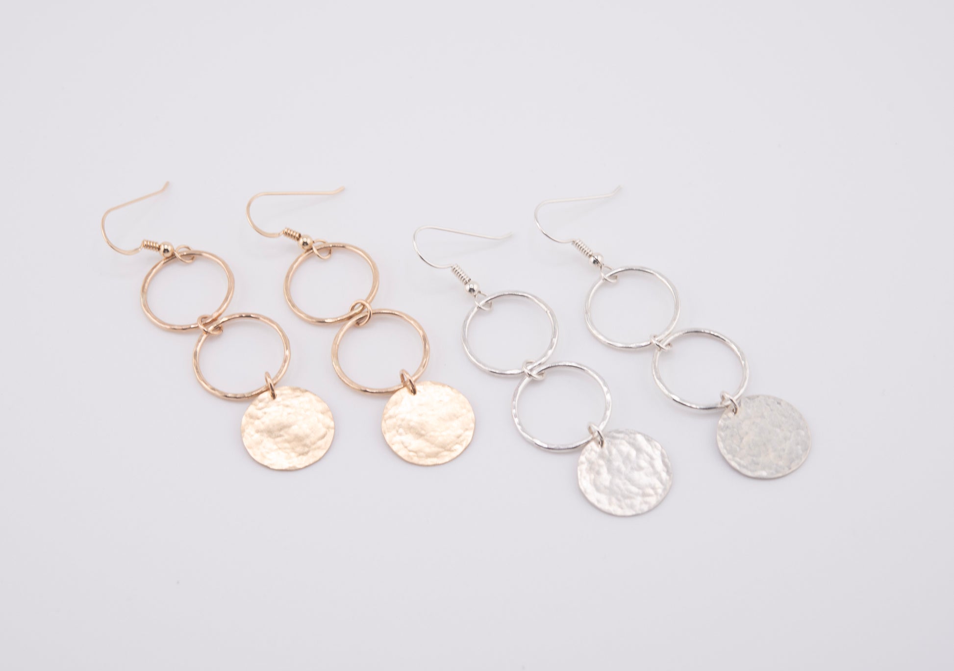 3 inch gold filled or sterling silver hammered metal dangle earrings with handmade rings.